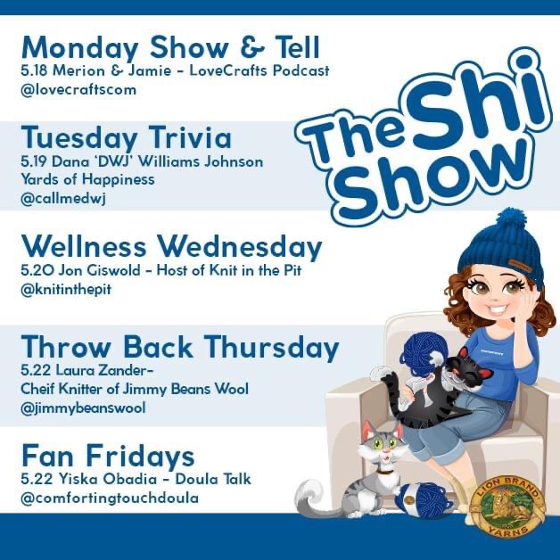 Join me tomorrow on Lion Brand yarn’s Facebook page for the Shi Show! It’s a live show everyday at noon, should be fun. Added bonus, Jellybean will be there too (I can’t do much without her these days). Go to their Facebook page to watch tomorrow.